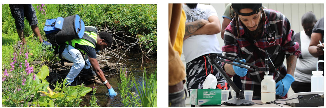 The Blackstone River Coalition staff collaborate with XCC to bring our crew members to various streams which are part of the Blackstone River watershed and train them how to correctly collect samples of stream water without contaminating the samples. Then they bring the crew members back to their laboratory and train them in how to measure dissolved oxygen, phosphorus, and nitrogen levels and for the presence of e-Coli bacteria.